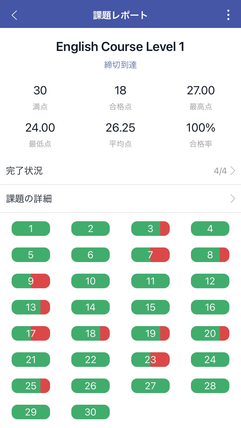 1. 課題レポートページでは、平均得点、合格率、各問題の正答率などの情報を確認できます。