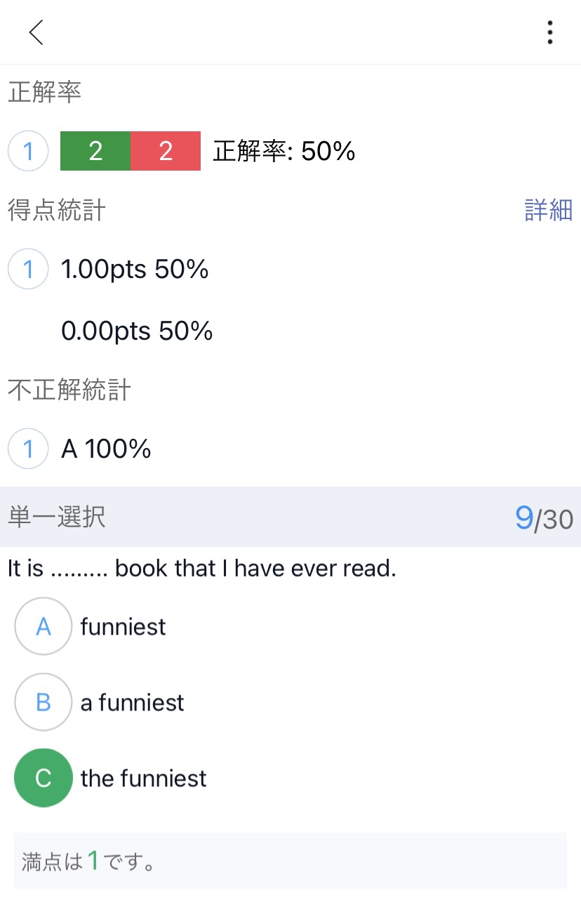 2. 問題番号をクリックすると、問題統計ページにアクセスできます。ここでは、その問題の得点分布や誤答率を確認できます。問題統計はExcelファイルにエクスポート可能です。