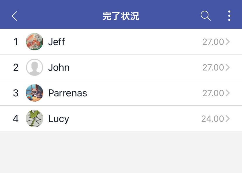 3. 課題の完了状況をクリックすると、課題の完了状況を確認できます。得点が高い順に並べ替えられています。完了状況はExcelファイルにエクスポートすることも可能です。