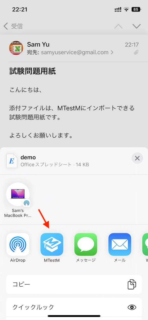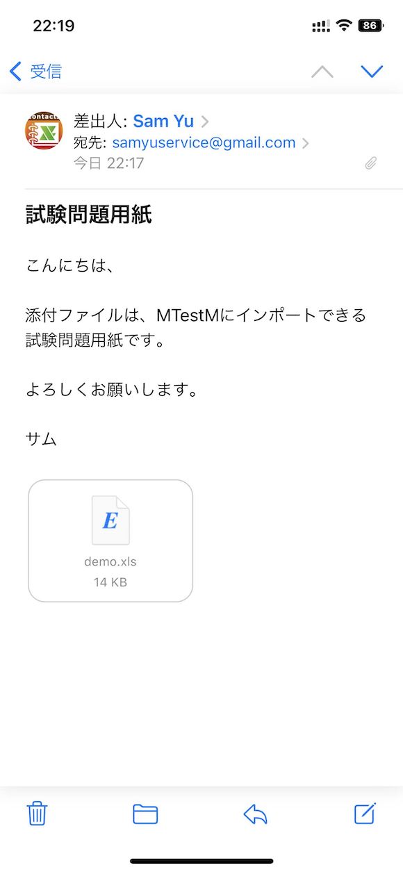 MTestMにExcelまたはZIPファイルをメールやファイル管理アプリを通じてインポートすることができます。以下の例では、メールアプリを使用してファイルをインポートする方法を説明します。