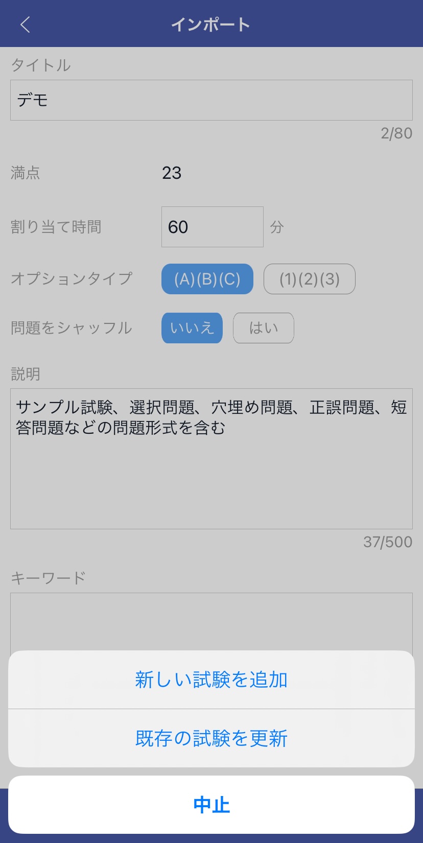 4. 保存ボタンをクリックし、新しい試験を追加を選択して新しい試験を作成します。既存の試験を更新したい場合は、既存の試験を更新を選択してください。