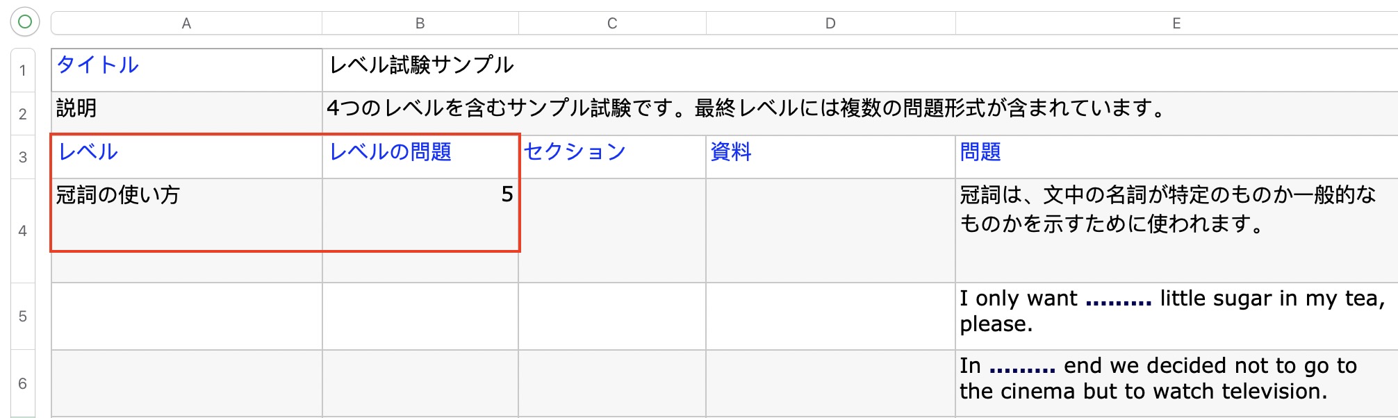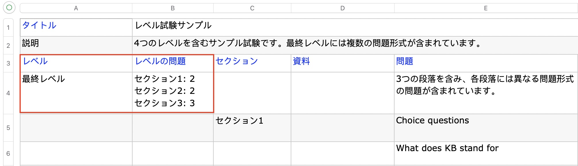 通常の試験と比較して、レベル試験のExcel表には「レベル」と「レベルの問題」の2列が追加されています。これら2列の意味は以下の通りです: