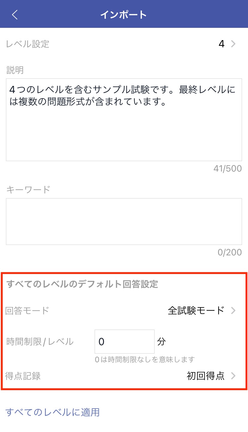 **p** レベル試験のインポート方法は通常の試験と同じです。インポート後、「レベル設定」に入り、各レベルの合格ルールを設定します。また、「すべてのレベルのデフォルト回答設定」セクションで全レベルの回答ルールを設定します。