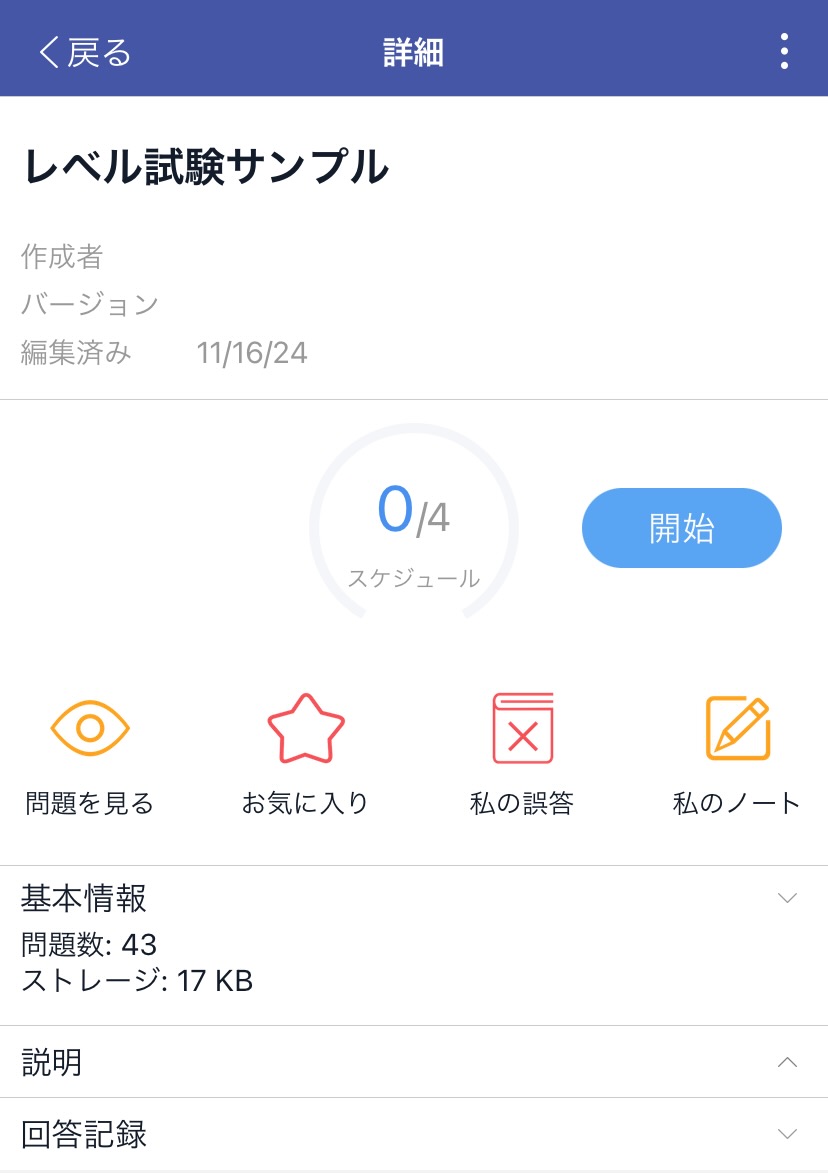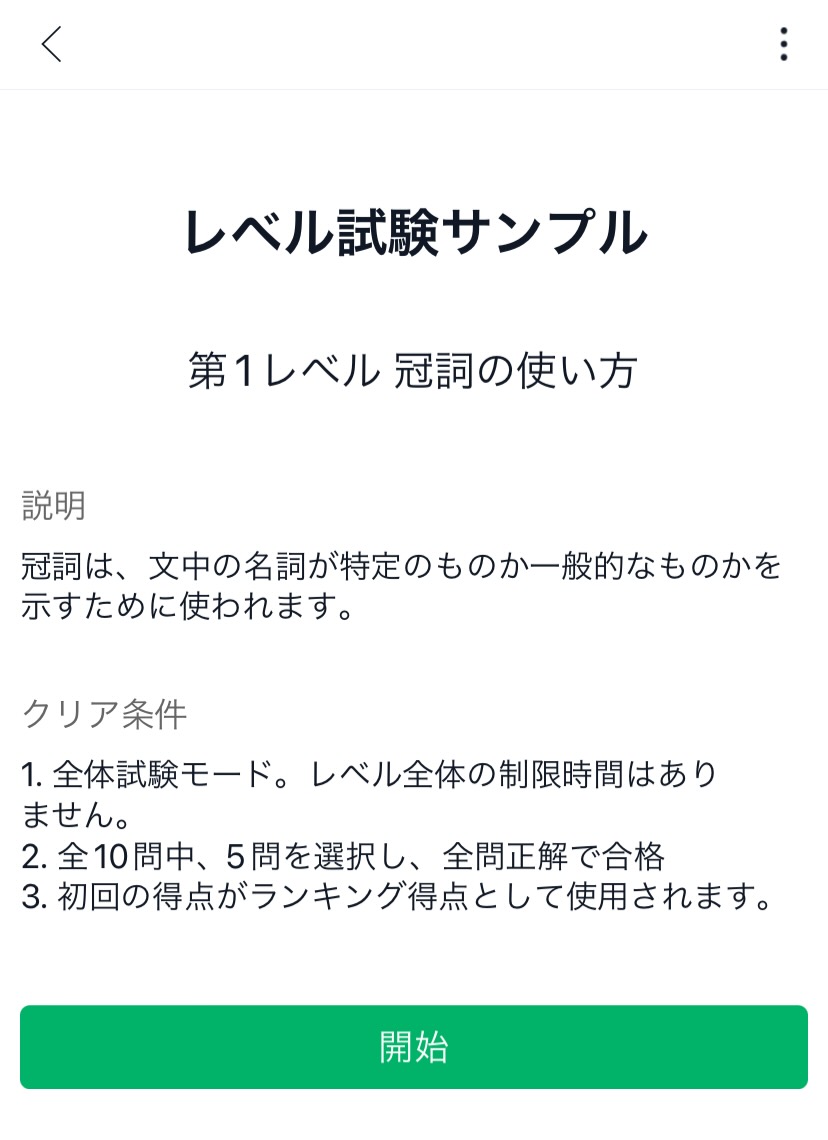 レベル試験の詳細ページに入り、「開始」ボタンをクリックしてレベル試験を開始します。