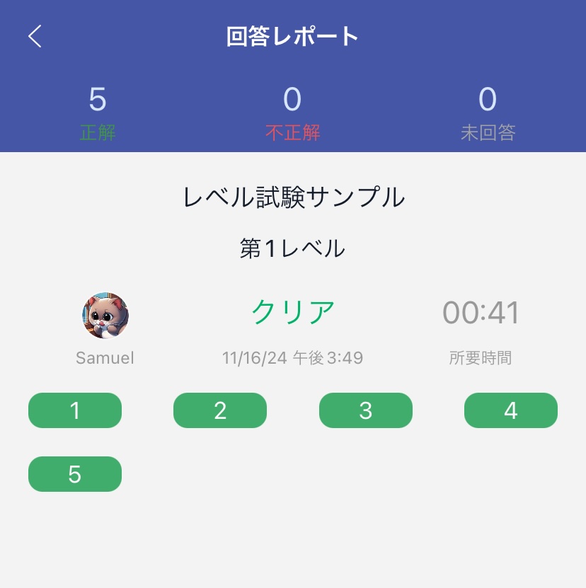 レベル試験は複数のレベルを含む試験です。各レベルにはさまざまな種類の問題が一定数含まれています。レベル試験を受験する際には、これらの問題の中からランダムに一定数の問題が選ばれます。レベルをクリアできるかどうかは、不正解数が許容範囲内であるかどうかに依存します。